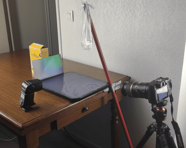 En fonction de comment vous allez orienter votre appareil photo (comme on va le voir juste après) vous aurez la possibilité de rajouter un fond. Vous pouvez par exemple coller votre fond sur une boîte de céréales pour le tenir à la verticale.